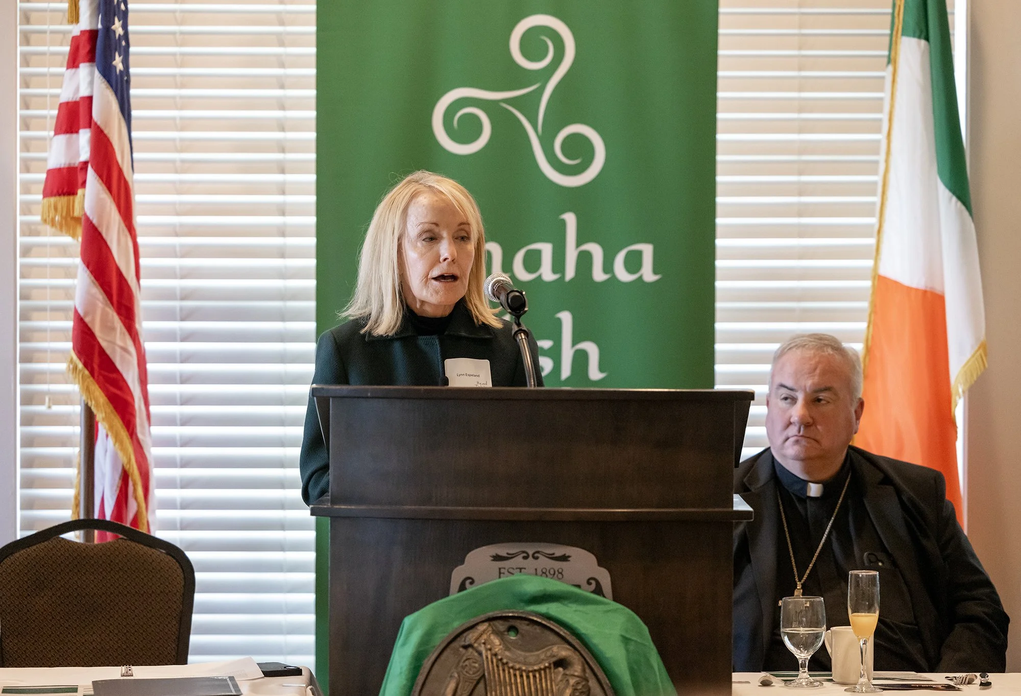 Lynn Espeland, Omaha Irish Cultural Center President, giving a warm welcome at the 11th Annual St. Patrick’s Day Awards Brunch. Also pictured: Archbishop Michael McGovern.